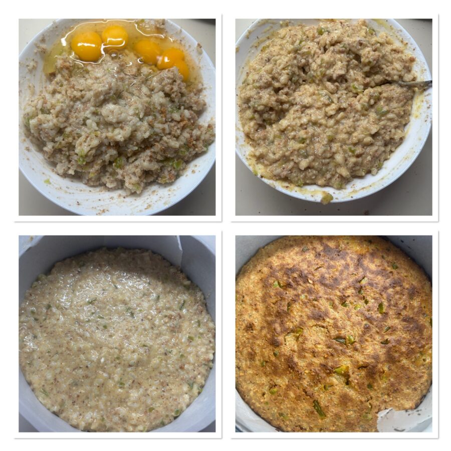 Voeg de eieren toe, meng goed en giet het mengsel in een met bakpapier beklede vorm. Bak gedurende 1 uur op 175°C, in de ovenstand zonder hetelucht.