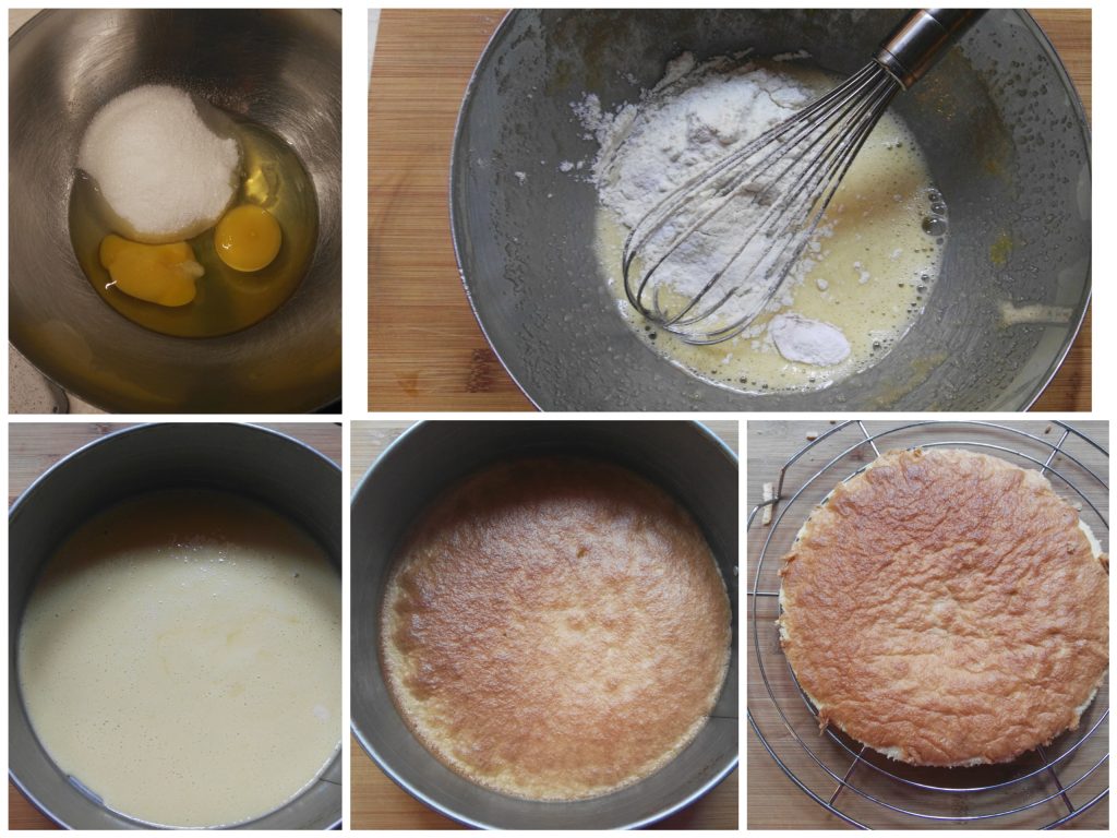 • Begin met het maken van het pandispanja-inzetstuk; als je geen zin hebt om te werken of de oven aan te zetten, gebruik dan savoiardi (lange vingers). Klop met de garde de suiker en de eieren tot ze schuimig zijn, voeg de bloem toe, voeg het bakpoeder toe en meng goed. Bekleed een springvorm van 26 cm met bakpapier, giet het beslag erin en bak ca. 10 minuten op 180°C. Doe de priktest met een satéprikker, haal uit de oven, laat iets afkoelen, stort het en laat volledig afkoelen op een rooster.