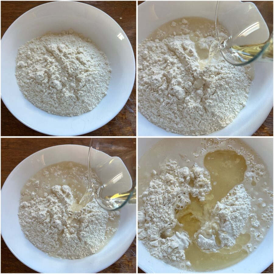 Doe de bloem in een ruime kom, voeg het zout, de extra vergine olijfolie en het water beetje bij beetje toe.