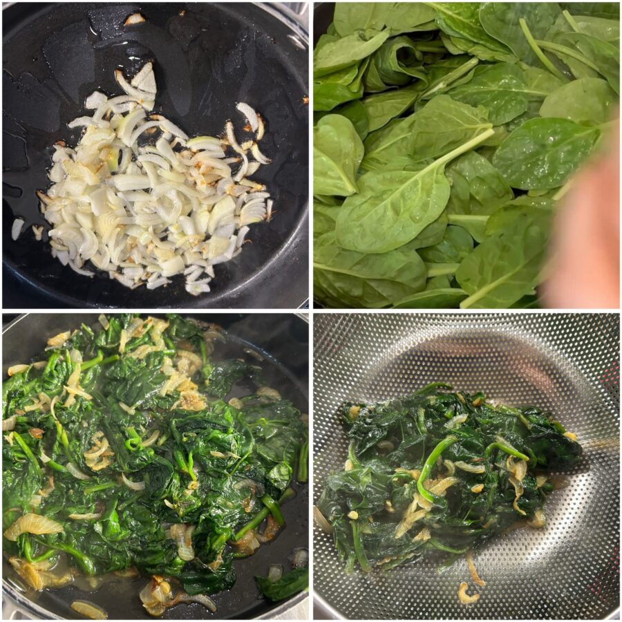 Voeg de spinazie (of snijbiet of veldgroenten) toe en bak ze tot ze volledig geslonken zijn.