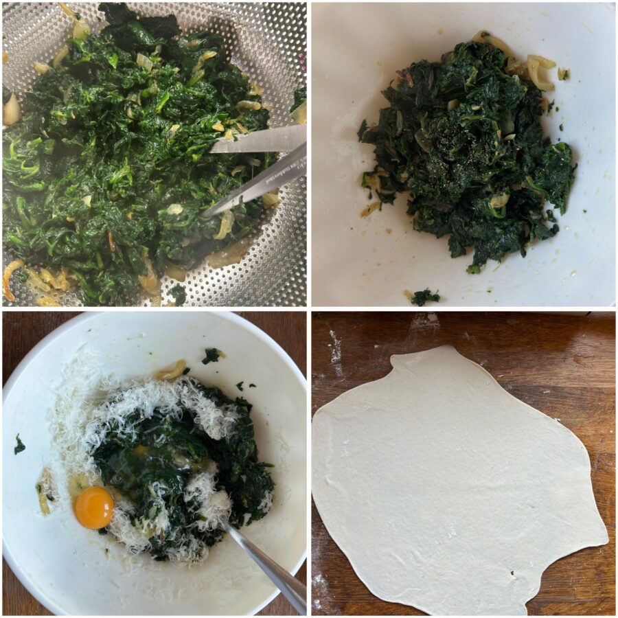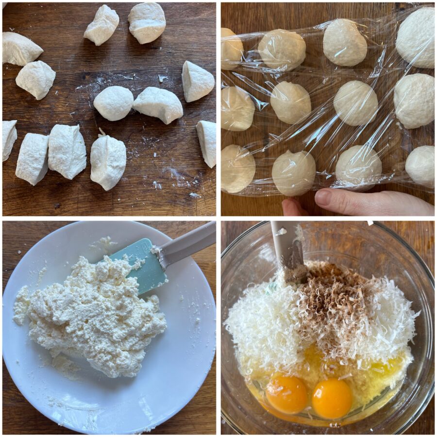 Laat ze minimaal 30 minuten rusten: deze stap is essentieel om zeer dunne vellen uit te rollen. Meng de ricotta goed (die zeer, zeer goed uitgelekt moet zijn) met eieren, zout, peper, kaas en nootmuskaat en zet apart.