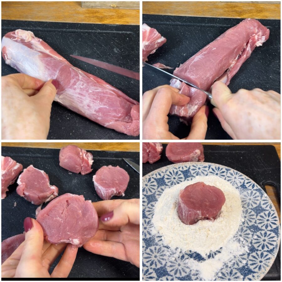 • Bereid nu de varkenshaas voor: verwarm de bouillon. Verwijder het vet van de hele haas en snijd hem in 5-6 medaillons en haal ze door de bloem zodat deze goed aan alle kanten hecht.