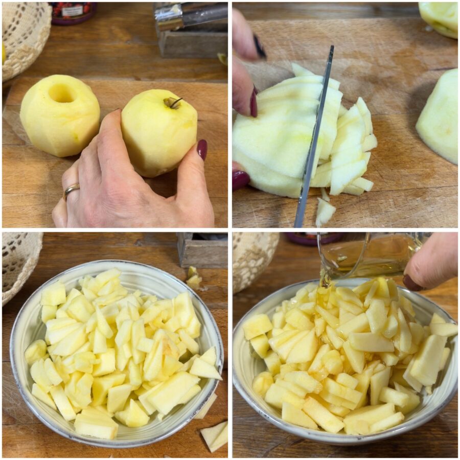 • Spoel de appels af, schil ze, verwijder het klokhuis en snijd ze in kleine blokjes. Doe ze in een kom en laat ze ongeveer tien minuten marineren met 25 ml azijn. Laat het vlees op kamertemperatuur komen.