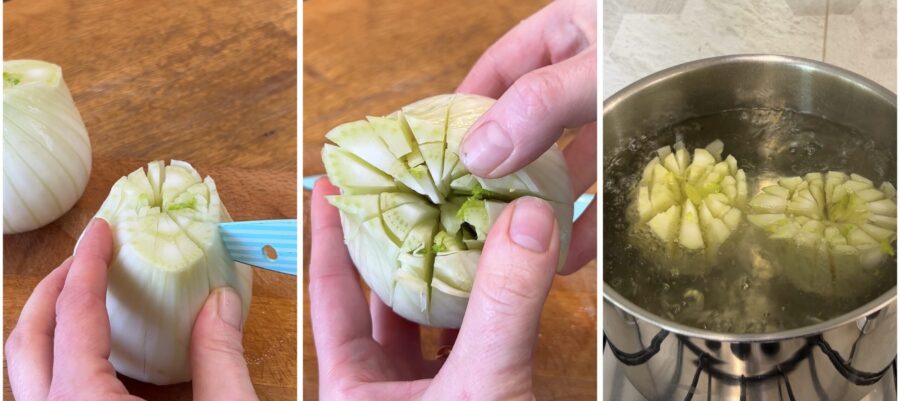 Verwijder de steel en de buitenste bladeren van de venkel, spoel ze af en snijd ze zo in dat er ‘blaadjes’ ontstaan, maar snijd niet door tot aan de onderkant. Blancheer ze 10 minuten in licht gezouten kokend water.