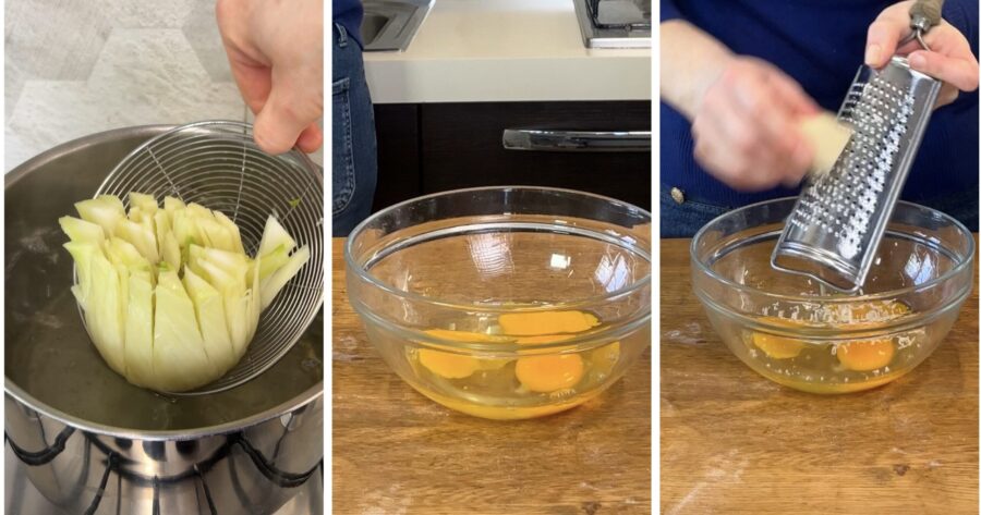 Giet ze af en zet ze opzij; klop ondertussen de eieren met de kaas,