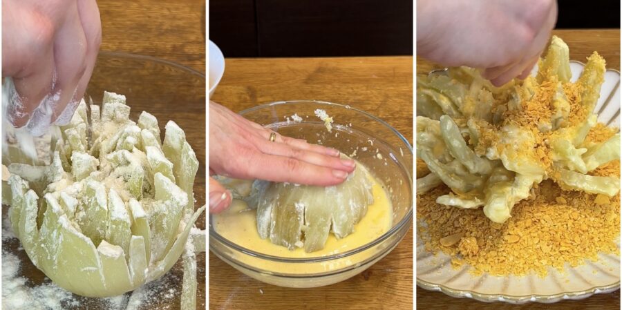 Haal de venkels door de bloem, zorg dat deze ook goed tussen de ‘blaadjes’ blijft zitten en niet alleen buitenop. Dompel ze vervolgens in het geklopte ei en zorg dat dit ze goed bedekt. Haal ze door de paneerlaag; ik gebruikte een eenvoudige paneerlaag van verkruimelde cornflakes die extra krokant worden.