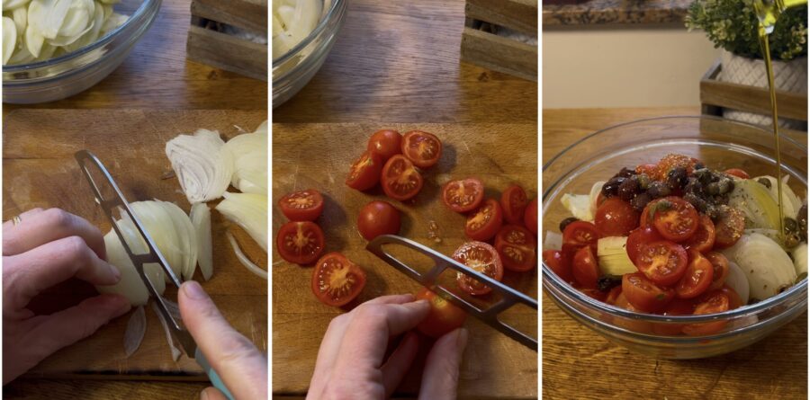 voeg de ui toe, geschild, afgespoeld en in plakjes gesneden. Voeg ook de gewassen en gehalveerde cherrytomaatjes toe, de olijven, kappertjes, zout, oregano en een scheutje olie.