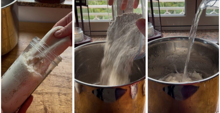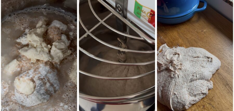 Als je geen zuurdesem hebt: meng 100 g bloem met 60 g water en 5 g verse biergist. Laat een nacht in de koelkast rijzen en ga dan verder zoals hierboven, gebruik dit deeg ter vervanging van de zuurdesem. De rijs tijden zullen sneller zijn en je moet je planning daarop aanpassen.