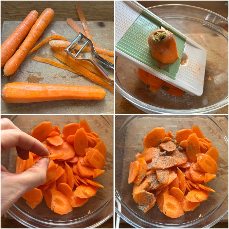 • Om wortelchips uit de oven te maken, was en schil je de wortels, snijd de uiteinden weg en snijd ze in heel dunne plakjes met een mandoline, dunschiller of een goed scherp mes.