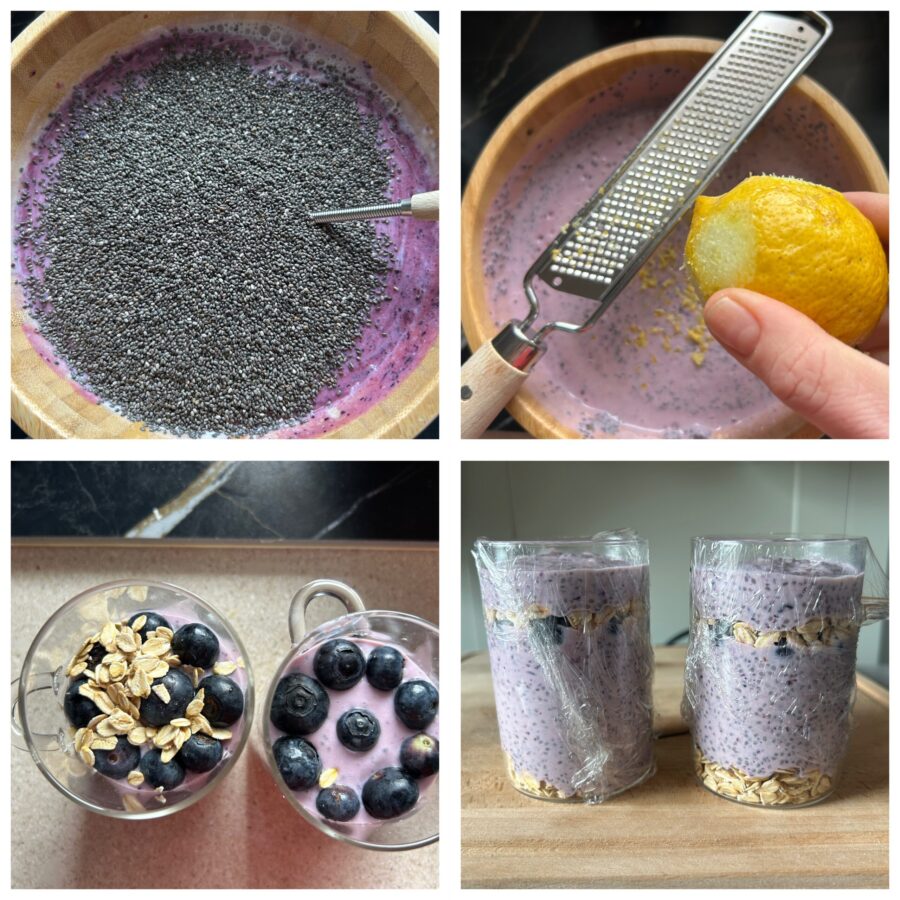Chiazaad, in contact met yoghurt, neemt langzaam vocht op en verandert in een natuurlijke crème, precies dik genoeg zonder extra toevoegingen. De bosbessen, gepureerd of deels heel gelaten, geven smaak en kleur, terwijl een beetje honing alles subtiel afrondt en de citroenrasp het geheel nog frisser maakt.