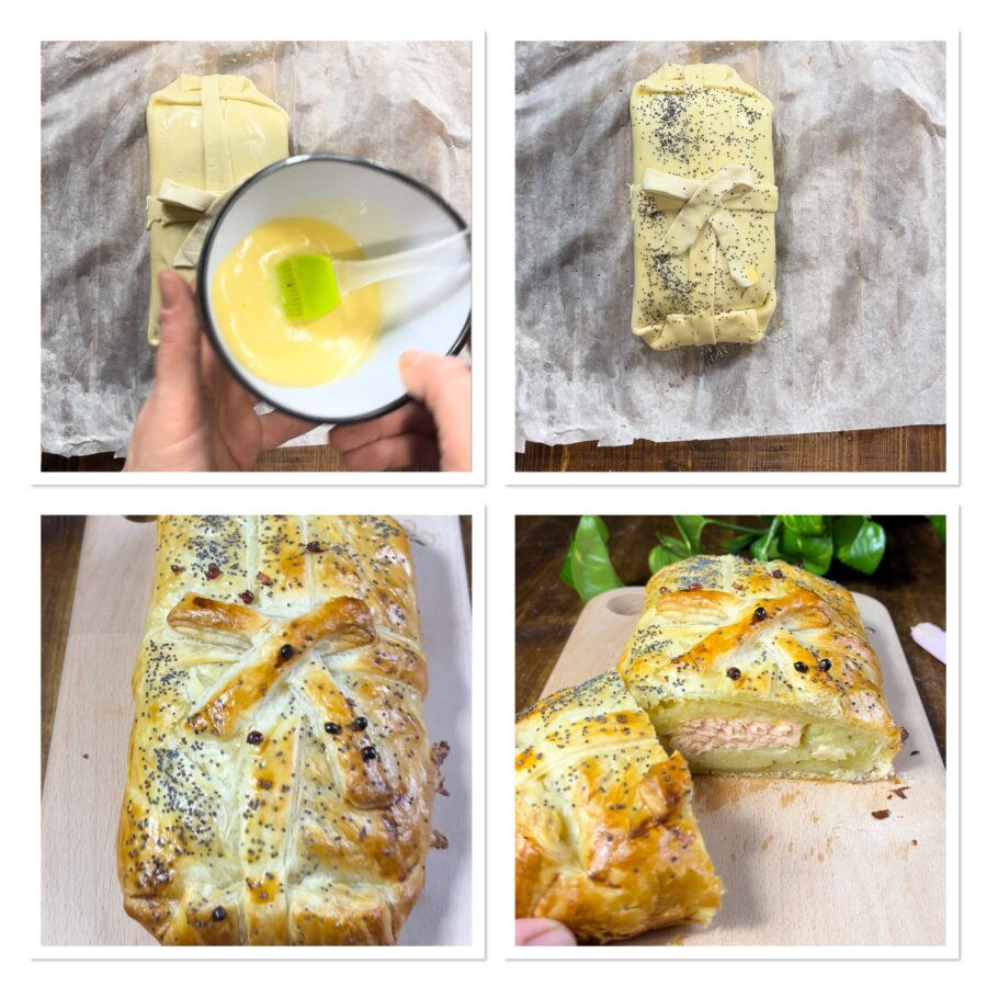 • Rol het bladerdeeg uit, leg de eerste filet erop en vouw dicht tot een pakketje en verwijder het overtollige deeg, dat je kunt gebruiken voor de decoratie. Doe hetzelfde voor de andere filet.