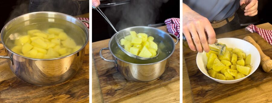 Doe ze in kokend water met een beetje zout, kook 7 minuten, schep ze vervolgens met een schuimspaan uit het water en doe ze in een kom. Kruid met zout, peper, olie en een snufje braadkruiden (of tijm en rozemarijn) en meng. Met deze stap worden de aardappelen in de oven samen met de zalm perfect gaar en lekker zacht.