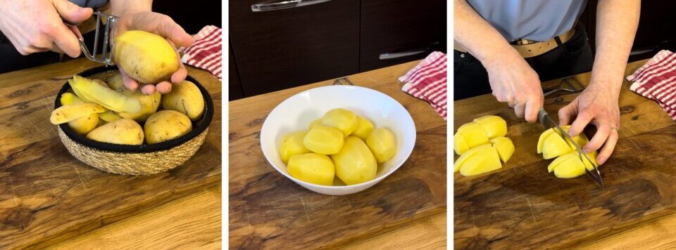 Schil de aardappelen, spoel ze af en snijd ze in grote stukken.