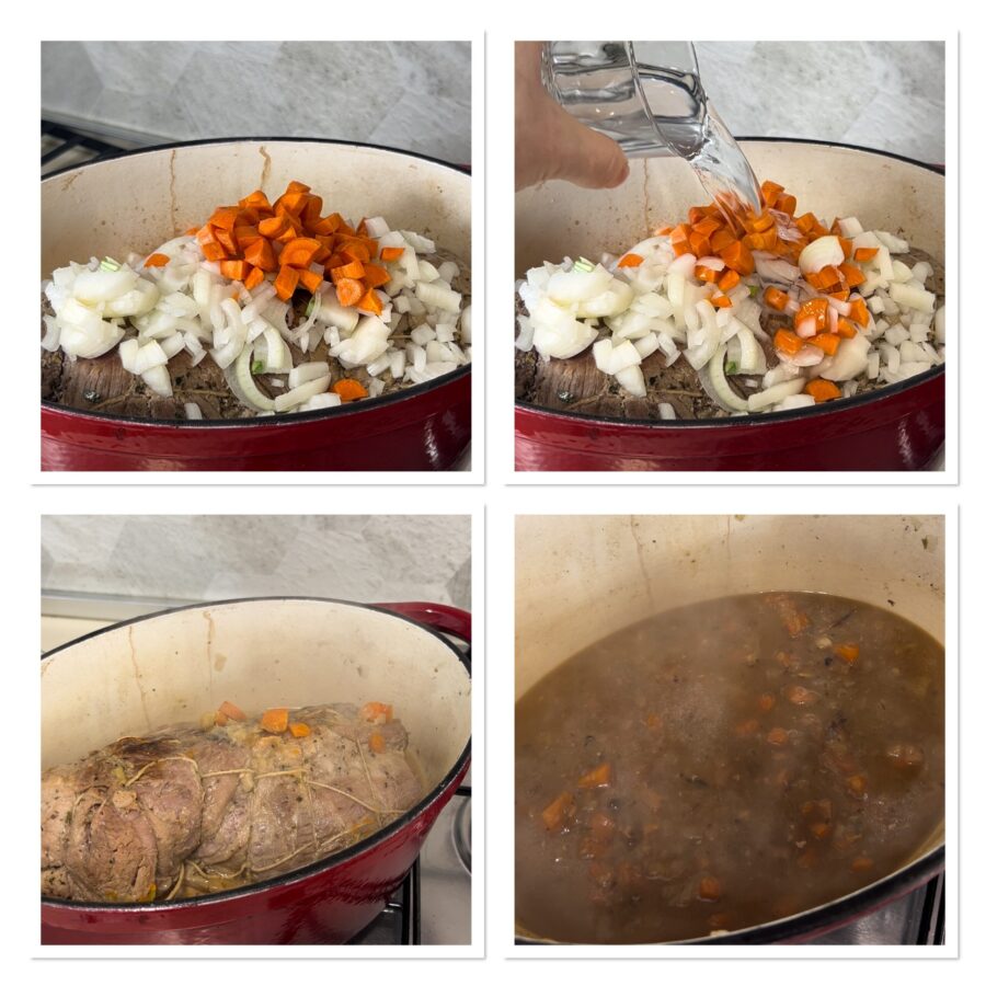 Draai het vuur lager, voeg een glas water toe, de geschilde en in blokjes gesneden wortels en uien en laat het minimaal twee uur en 15 minuten sudderen; normaal gesproken hoef je geen extra water toe te voegen behalve dit en het vocht dat het vlees zelf afgeeft.