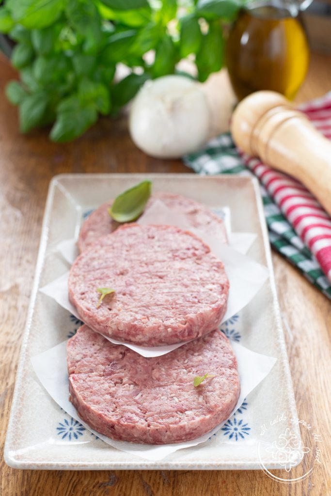 • Leg de hamburgers op een gloeiend hete grillpan, zet het vuur laag en bak ze 2 minuten per kant zodat ook de tweede kant kleur krijgt; zet het vuur aan het einde weer wat hoger. De hamburgers zijn klaar; serveer ze direct warm op tafel (de volgende foto toont de bereidingswijze van gevulde hamburgers).