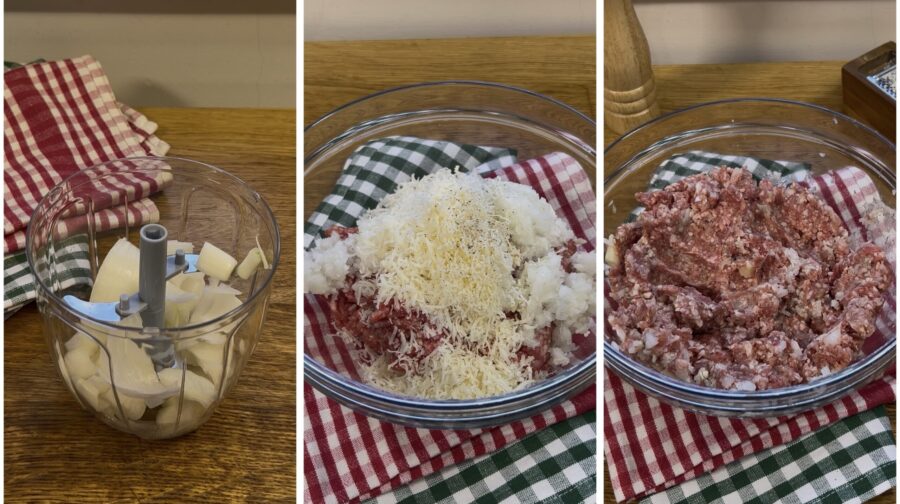 • Doe de ui in de kom van de blender en hak deze zeer fijn. Verzamel de fijngesneden ui in een kom samen met de geraspte kaas, zout en peper. Meng alles goed door elkaar en