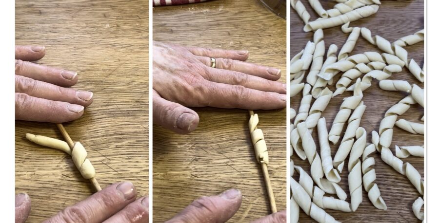 Verdeel de streng in gelijke stukken van circa 10 cm en draai ze rond het stokje met een langzame handbeweging. Druk vervolgens heen en weer met de hand, zoals in de video hieronder. Schuif de pasta voorzichtig van het stokje en leg ze op een schone theedoek.