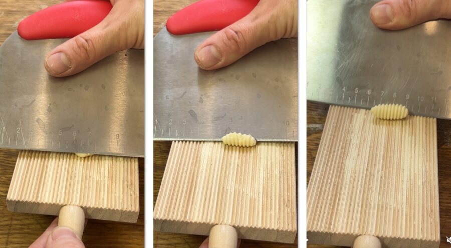 rol je dunne rolletjes van minder dan 1 cm dikte, snijd deze vervolgens in stukjes van ongeveer 1 cm. Bestuif lichtjes het rigagnocchi en gebruik twee vingers of, zoals ik doe, een spatel,