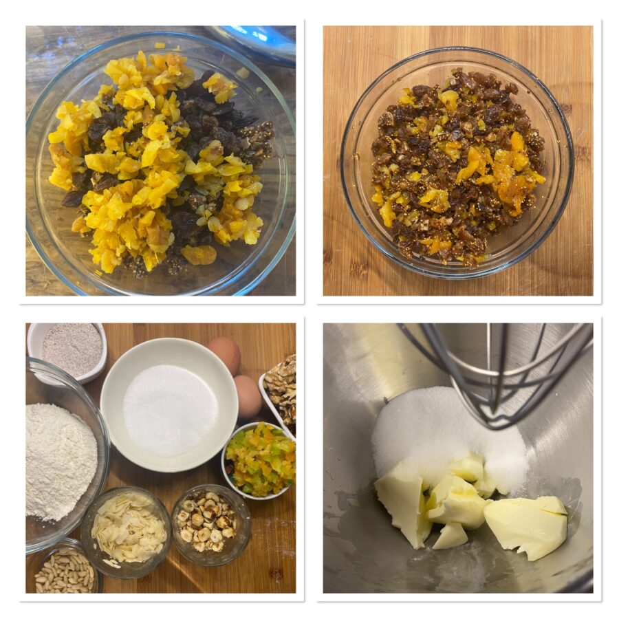 Hak de vijgen en ontpitte dadels fijn en, in mijn geval, ook de gedroogde abrikozen die oma altijd gebruikte. Doe ze in een kom met de rozijnen, giet de grappa erbij en laat 6 uur wellen.