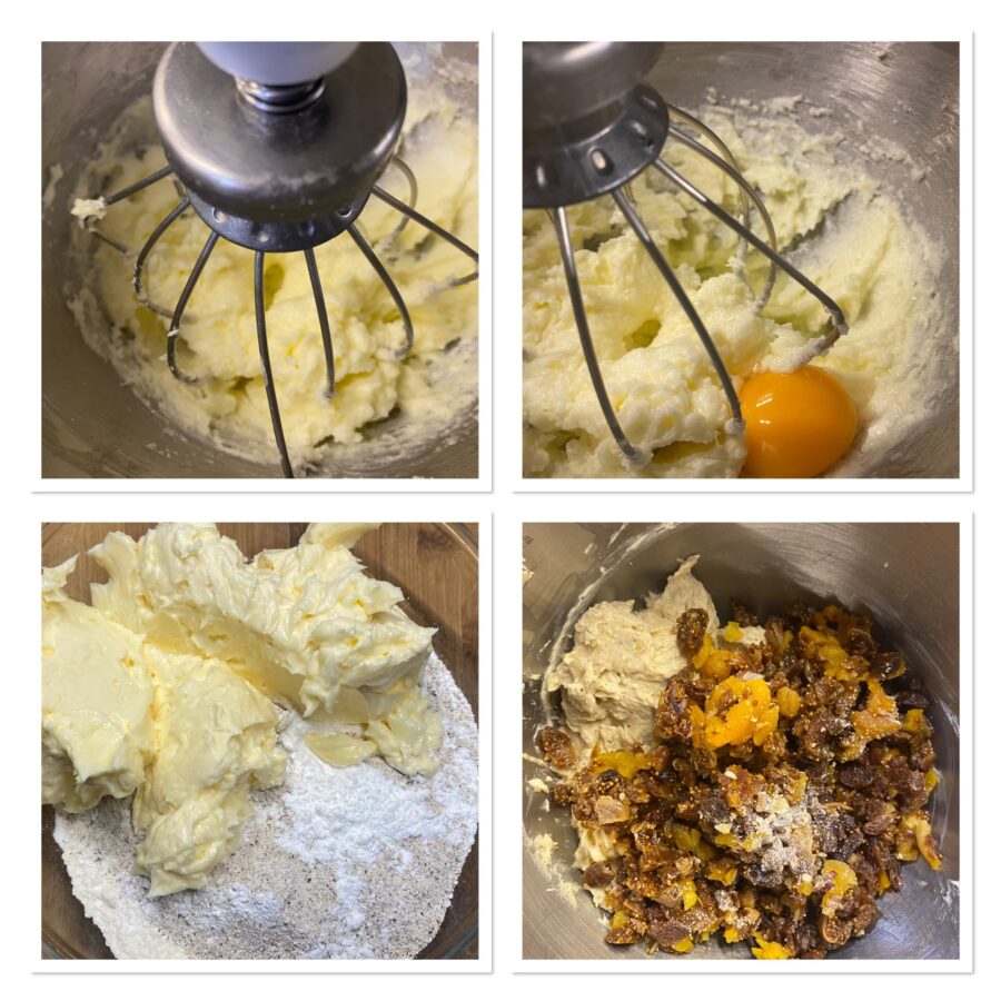 Spatel de bloem en het bakpoeder voorzichtig door het mengsel. Voeg de fijngehakte hazelnoten toe, bijna alle gehakte walnoten, de amandelschaafsel of -gehakte gepelde amandelen, bijna alle pijnboompitten, het met grappa geweekte fruit, vanille-extract, kaneel, geraspte sinaasappel- en citroenschil, een snufje zout, stukjes gekonfijte sinaasappel en cedro en voeg ook 3–4 in stukjes gesneden gekonfijte kersen (rood en groen) toe. Meng voorzichtig en voeg indien nodig een beetje melk toe als het mengsel te droog lijkt.
