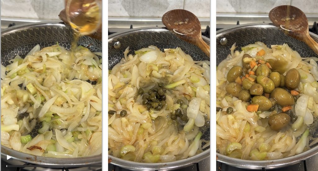 de olijven, de kappertjes, de honing, de suiker, de rozijnen en laat het geheel op hoog vuur doorgaren terwijl je vaak roert gedurende enkele minuten. Het recept bevat geen wortelen; die die je ziet behoren tot de huisgemaakte olijvensmaakmaker die ik maak (Geplette Siciliaanse olijven).