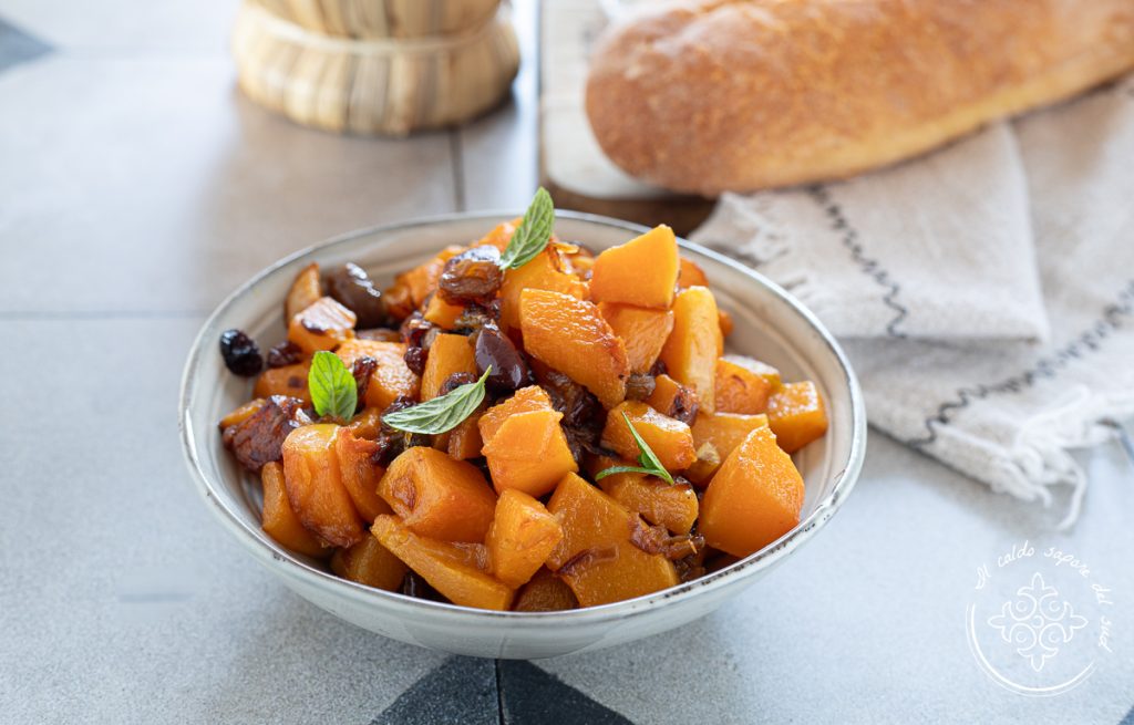 Zoetzure pompoen op Siciliaanse wijze of zoetzure pompoen in de pan met ui en olijven: een heerlijk vegetarisch gerecht, dat zowel als voorgerecht of als bijgerecht kan dienen en doet denken aan de beroemde Siciliaanse caponata. Ik houd van herfstgerechten en vooral van recepten met pompoen, dus dit seizoensgroente ontbreekt in zijn beste periode nooit op mijn tafel. Vandaag wil ik jullie mijn versie van de zoetzure Siciliaanse pompoen, met uien, rozijnen en olijven vertellen, een recept dat ik ooit proefde in een restaurant dat traditionele Siciliaanse keuken bereidde en waar ik erg van hield. Ik weet dat velen van jullie geen fan zijn van pompoen — ook in mijn familie verdragen bijna niemand het (ik zou de uitzondering zijn)! In mijn huis betekent het zeggen of kopen van pompoen geklaag, ja want er is geen groente die meer gehaat wordt! Wil je iets weten? Hoe meer zij het haten, hoe meer ik ervan houd en door toch door te gaan met het kopen, ondanks hun protesten, “dwing” ik mezelf het in steeds smakelijkere en aantrekkelijkere recepten te verwerken zoals deze! De zoetzure pompoen in de pan, met ui, rozijnen en olijven is een onweerstaanbare zoetzuur lekkernij, en ik zweer dat toen ik het op tafel zette, ze het hebben opgegeten en zelfs brood om de saus op te dippen! Klaar om me te volgen in de keuken? Laten we gaan, en voordat we gaan koken herinner ik je eraan dat je, als je op de hoogte wilt blijven van al mijn recepten, mijn Facebookpagina (hier) en mijn Instagramprofiel (hier) kunt volgen.