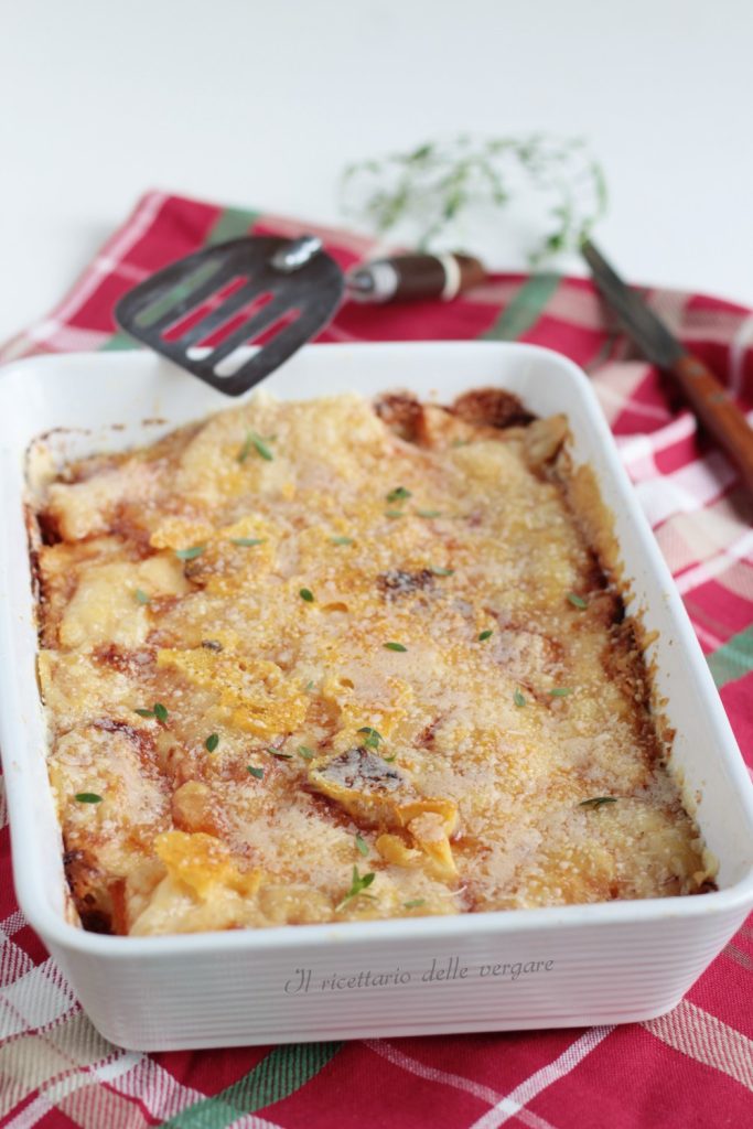 • Ga zo door tot alle pompoen en andere ingrediënten op zijn. Voeg op de laatste laag geen scamorza toe, houd deze apart, omdat je deze kort voor het einde van het koken met oregano blaadjes erop toevoegt. Hierdoor blijft het smeuïg.