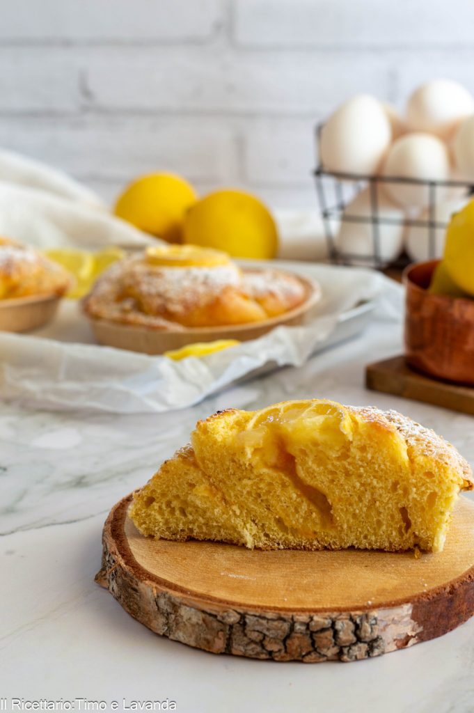 De zeer zachte citroen brioche is ideaal voor het ontbijt. Deze citroen brioche is gevuld met citroenjam die ik thuis heb gemaakt met de geweldige Siciliaanse citroenen. Het is heel eenvoudig te maken en dit deeg is ook met de hand heel goed te bewerken. Ik heb een rechthoek gemaakt die, eenmaal gevuld, ik heb opgerold en in plakken van ongeveer 2 cm heb gesneden. Ik heb ze in bakvormpjes van bakpapier geplaatst, maar het is ook mogelijk om ze in een springvorm van 24-26 cm te plaatsen om een grote brioche te maken. Geïglazuurd met een pistacheglazuur dat ze krokant aan de oppervlakte maakt en versierd met een citroenschijf die tijdens het bakken al zijn smaak en aroma vrijgeeft. Voor de lekkerbekken is het mogelijk om ze te vullen met de lemon curd met een zure en boterachtige smaak. Als u van de smaak van citroen houdt, raad ik u aan ook de Pan di limone of de Meringue taartjes met citroen te proberen.