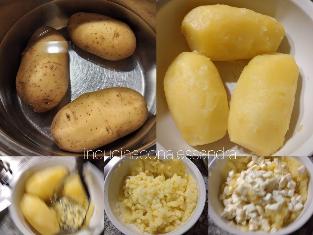 Was eerst de aardappelen goed, vul een pan met water, voeg de aardappelen toe en kook ze, wanneer de vork erin gaat, zijn ze klaar. Zorg ervoor dat ze stevig blijven en niet zacht, anders nemen ze te veel water op. Na het koken spoel je ze een paar minuten onder stromend water, verwijder dan de schil, doe ze in een kom en pureer ze met een aardappelstamper, voeg de in blokjes gesneden mozzarella en brie toe, het zout, de peper en de olie, goed mengen.