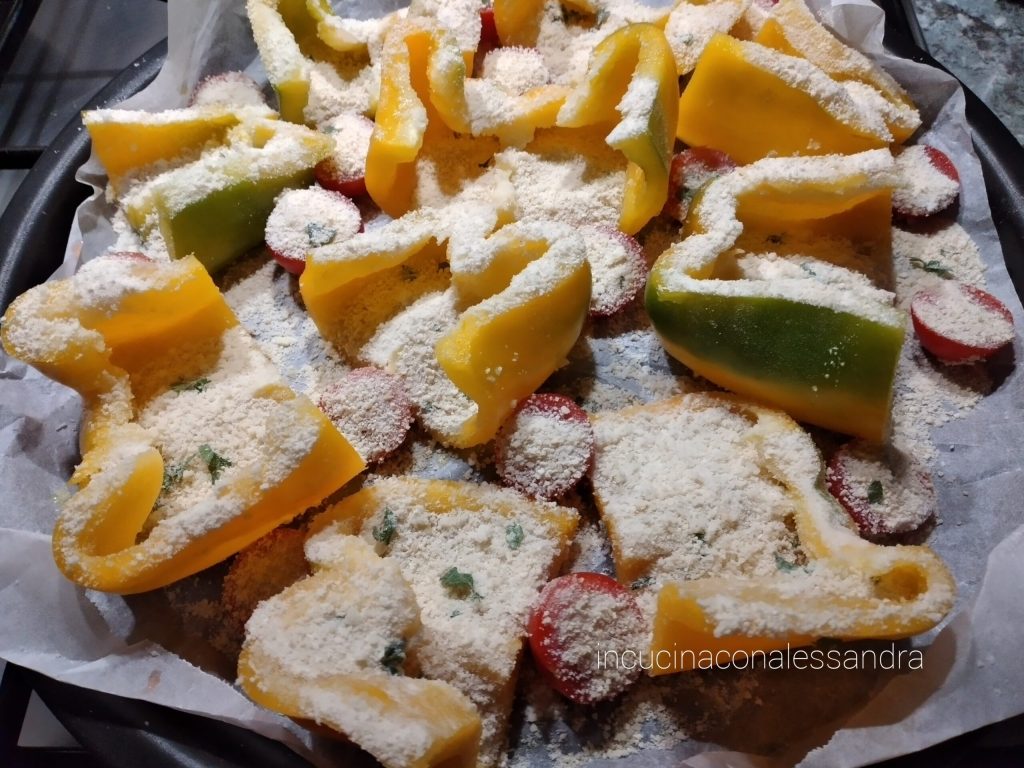 Was eerst de cherrytomaten en paprika’s goed, halveer de cherrytomaten, halveer ook de paprika’s en maak ze van binnen schoon door de zaden en witte draden te verwijderen, ik heb ze nogmaals doormidden gesneden, in feite in 4 stukken omdat ze groot waren, als je ze kleiner vindt, laat ze dan maar half, maar onthoud dat je er meer nodig hebt. Doe een beetje paneermeel in een kom, ik doe het op gevoel, het hangt ook af van hoeveel je wilt vullen, voeg de geraspte Parmezaanse kaas, fijngehakte knoflook, gehakte peterselie, chilipeper, zout en een beetje extra vierge olijfolie toe en meng.