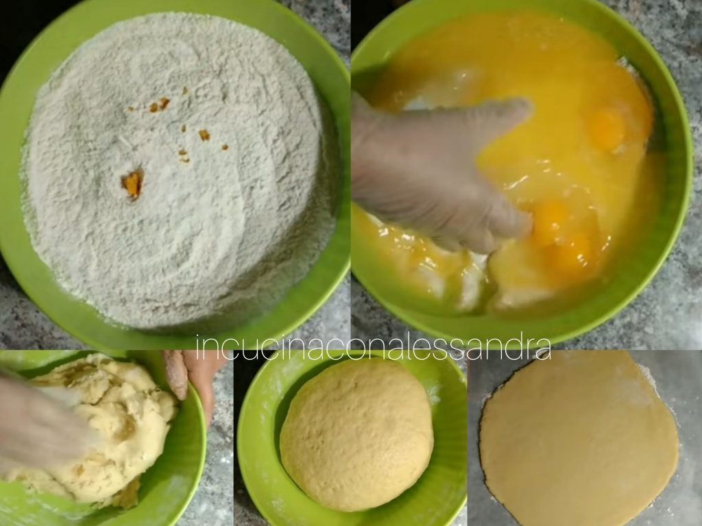 Doe in een kom de gezeefde bloem en bakpoeder, de geraspte schil van de sinaasappel, de suiker, 3 eieren, het sap van de sinaasappel, de sambuca, de gesmolten boter en begin te mengen met de handen. Blijf goed kneden totdat het een glad en compact deeg wordt, zoals zanddeeg maar zachter. Laat 15 minuten rusten. Rol het deeg daarna met behulp van een deegroller uit tot een dikte van ongeveer een halve centimeter.