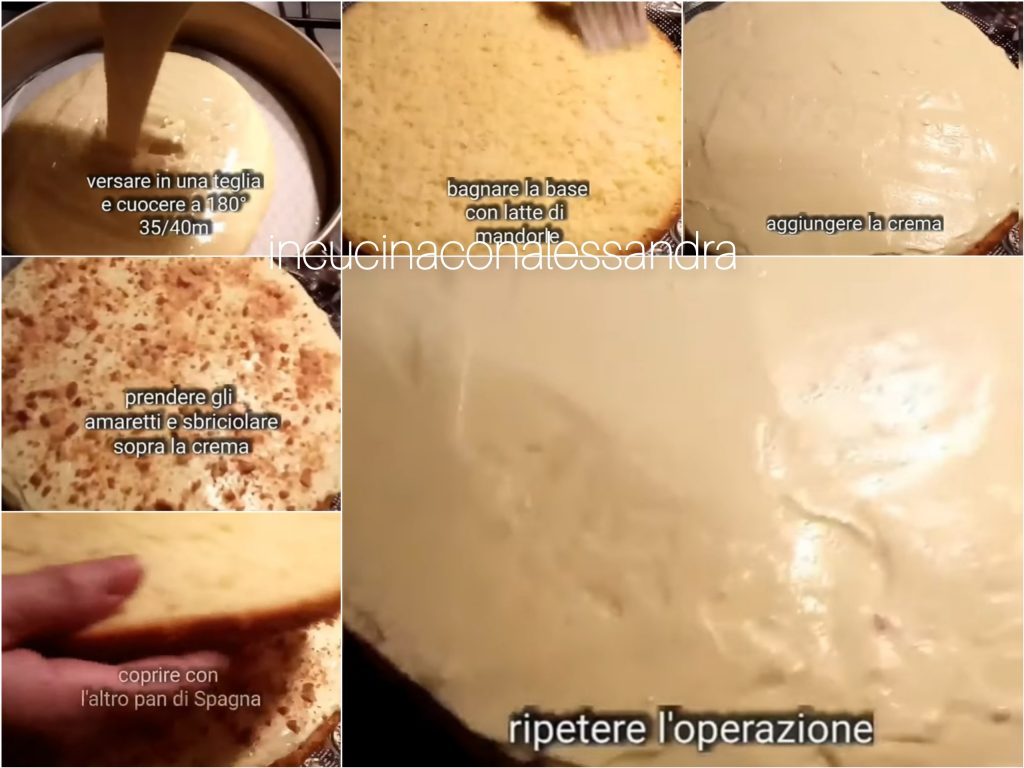 Op dit punt beginnen we met het vullen, bevochtig de basis met amandelmelk en voeg een laag crème toe, verkruimel de amaretti bovenop de crème, bedek met de andere biscuit en herhaal de vorige stap, eerst bevochtigen dan rijkelijk met crème. Neem de overgebleven biscuit, verwijder de donkere delen, snijd in stroken en snijd dan in kleine blokjes, waarmee je de taart bedekt en het mimosa-effect geeft, als er stukjes verkruimelen, gebruik ze om eventuele gaten op te vullen.