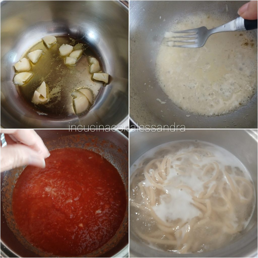 Schil allereerst de tenen aglione en snijd ze in stukjes, doe ze in een steelpan met een beetje extra vergine olijfolie en een paar korrels grof zout, laat op laag vuur koken tot ze zacht worden en pureer ze dan met een staafmixer tot een crème, ik laat een paar stukjes over, ik vind het lekkerder. Voeg dan de tomatenpulp, fijngehakte chilipeper en het zout toe en laat ongeveer 20 minuten koken. Zet ondertussen het water op het vuur, voeg zout toe en als het kookt, voeg de pici toe en kook ze, zodra ze gaar zijn, giet ze af en meng ze met de bereide saus goed door elkaar.