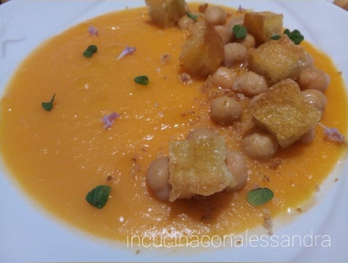 De pompoensoep met kikkererwten is een zeer gladde en homogene crème, snel en gemakkelijk te bereiden, ideaal als voorgerecht of hoofdgerecht vergezeld van croutons, perfect voor koele avonden en gegarandeerd een geweldig resultaat… Het zal ook bij uw kinderen in de smaak vallen.