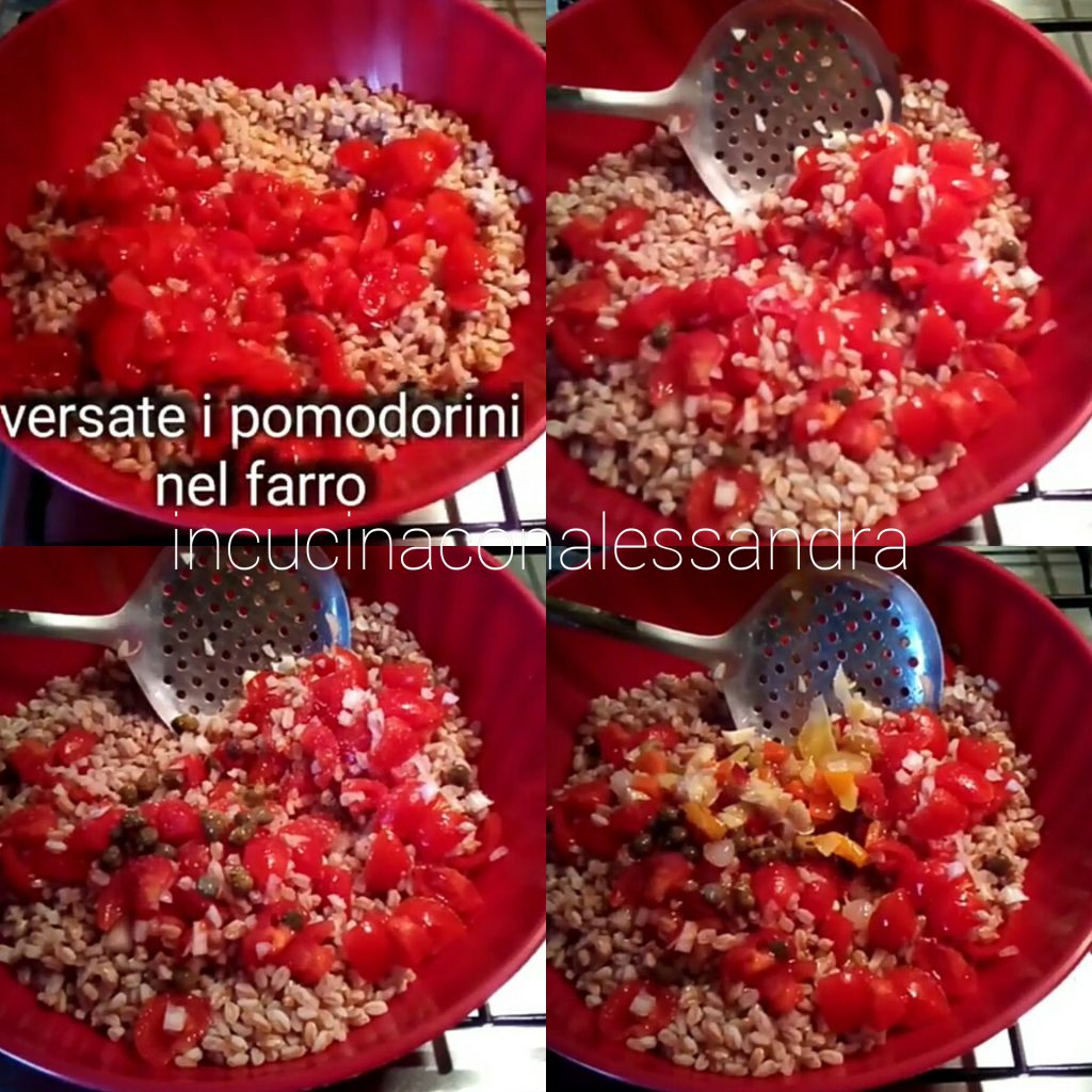 Allereerst de spelt ongeveer 10 minuten in water laten weken, zodat de onzuiverheden naar boven komen, en daarna de spelt onder stromend water wassen. Kook in een pan met ruim gezouten water, ongeveer 20/22 minuten vanaf het moment dat het kookt. Wanneer het gaar is, giet het af en spoel het onder stromend water om het koken te stoppen, laat het volledig afkoelen en plaats het in een slakom. Bereid ondertussen de dressing voor, was de tomaatjes goed en snijd ze in stukjes, snijd de ui en de groenten in kleine stukjes, voeg alles samen met de spelt, voeg zout, de eetlepel kappertjes en de olie toe en meng goed, voeg dan de gesneden of licht gehakte basilicum toe en meng opnieuw. Laat minimaal een half uur in de koelkast rusten voordat je het consumeert.