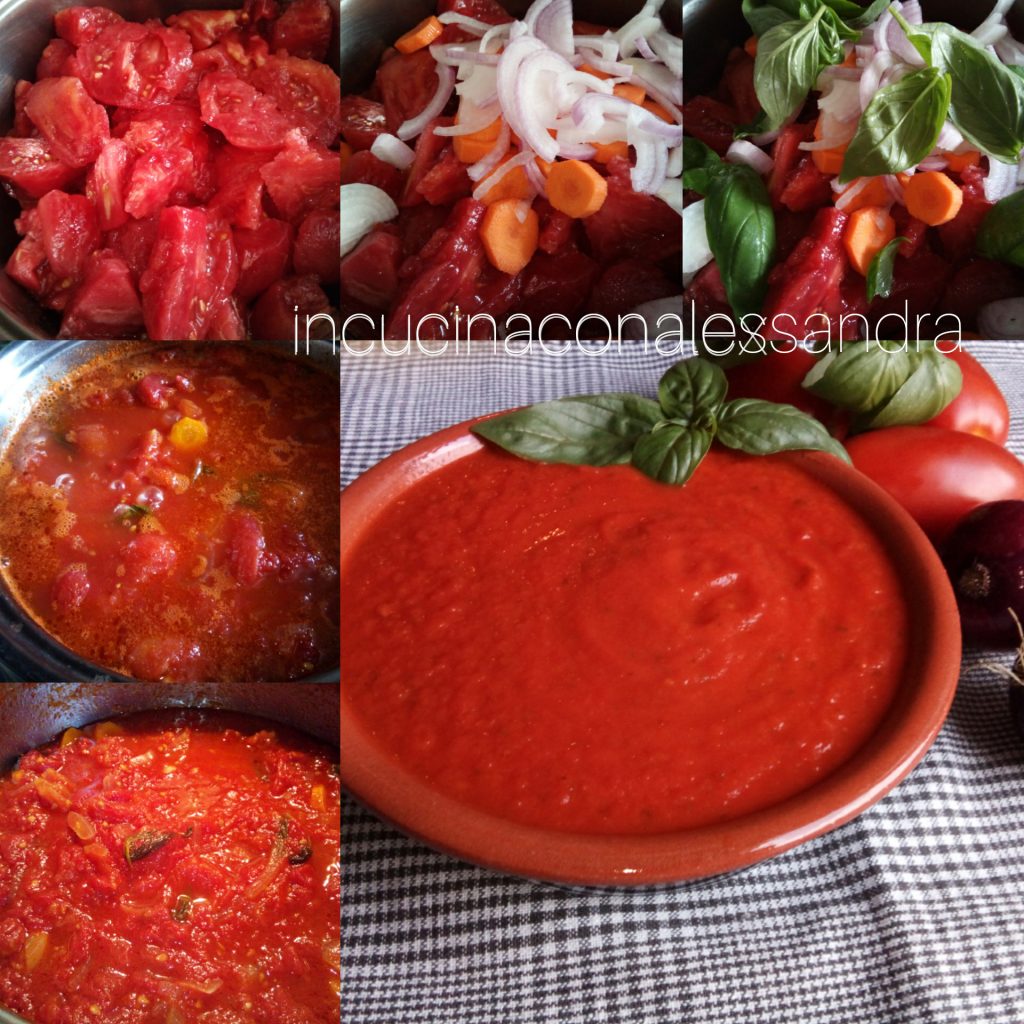 Was eerst de tomaten goed en schil ze rauw. Snijd ze in stukjes en leg ze in een hoge pan, snijd de ui en wortelen in stukjes en voeg ze toe aan de tomaten. Voeg dan de basilicum, het zout en de olie toe. Zet op het vuur en zodra het kookt, laat het ongeveer 50/60 minuten koken, houd er rekening mee dat de tomaat water geeft en moet inkoken.