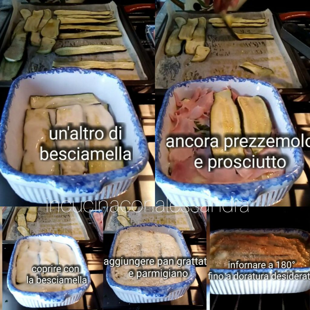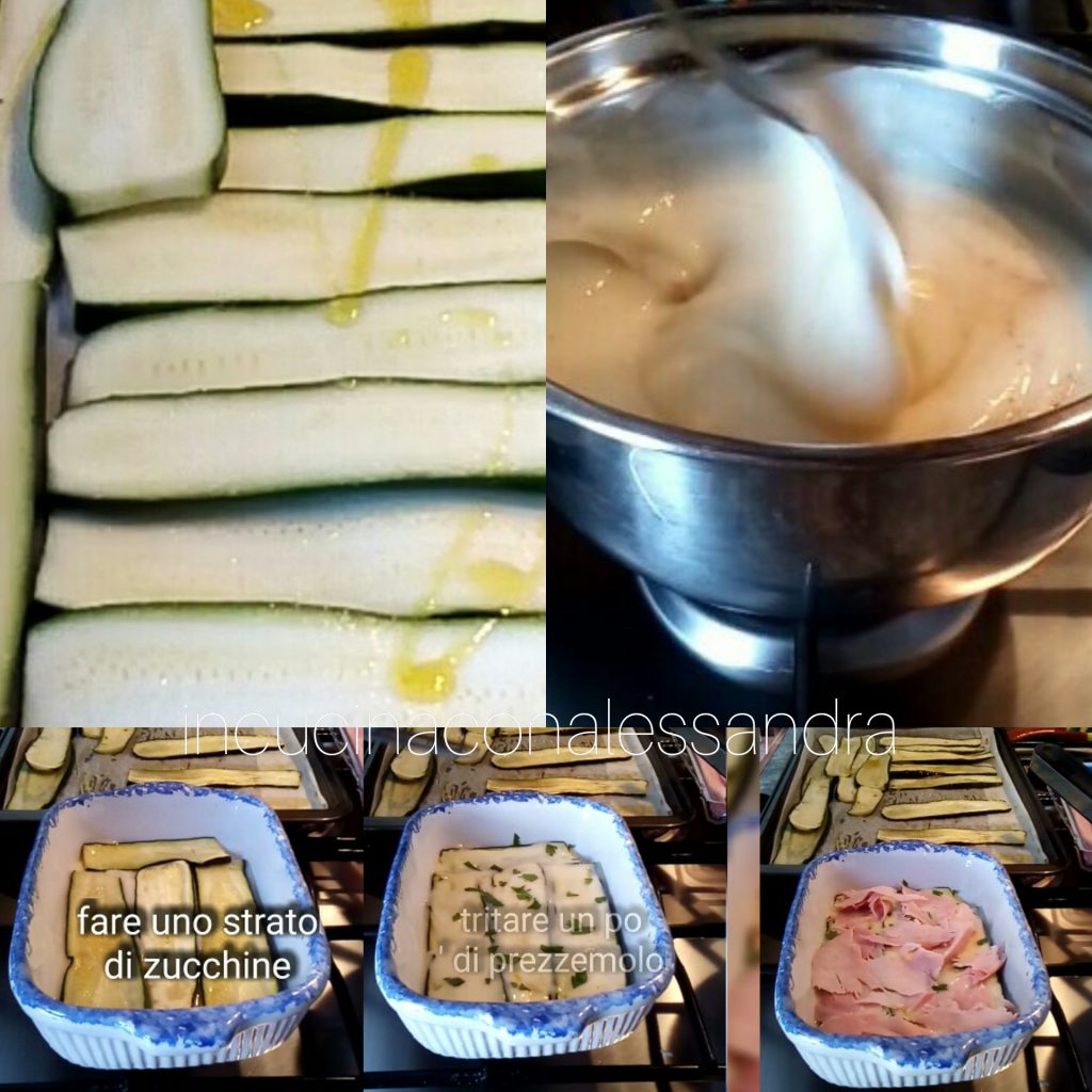 Maak eerst de courgettes schoon en was ze. Snijd ze in de lengte in plakjes, leg de plakjes op een bakplaat bekleed met bakpapier, zout ze, voeg een scheutje olie toe en bak ze ongeveer 10/12 minuten op 180°C. Bereid de bechamelsaus, je vindt het recept op de blog. In een ovenschaal een laag bechamelsaus aanbrengen, een laag courgettes, nog een laag bechamelsaus, een beetje fijngehakte peterselie toevoegen, een laag ham. Herhaal de operatie totdat de ovenschaal vol is, bedek alles met bechamelsaus en een laagje paneermeel. Bak in een voorverwarmde oven en kook ongeveer 25/30 minuten op 180°C tot de gewenste goudbruinheid.