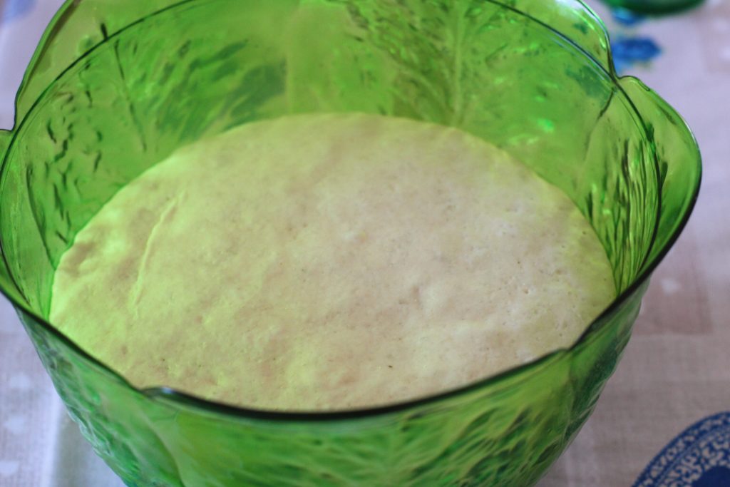 Vet een kom in met extra vergine olijfolie en laat het deeg rijzen, afgedekt met plasticfolie in de oven met het licht aan. Het moet in volume verdubbelen. Ik heb het ongeveer 3 uur laten rijzen.