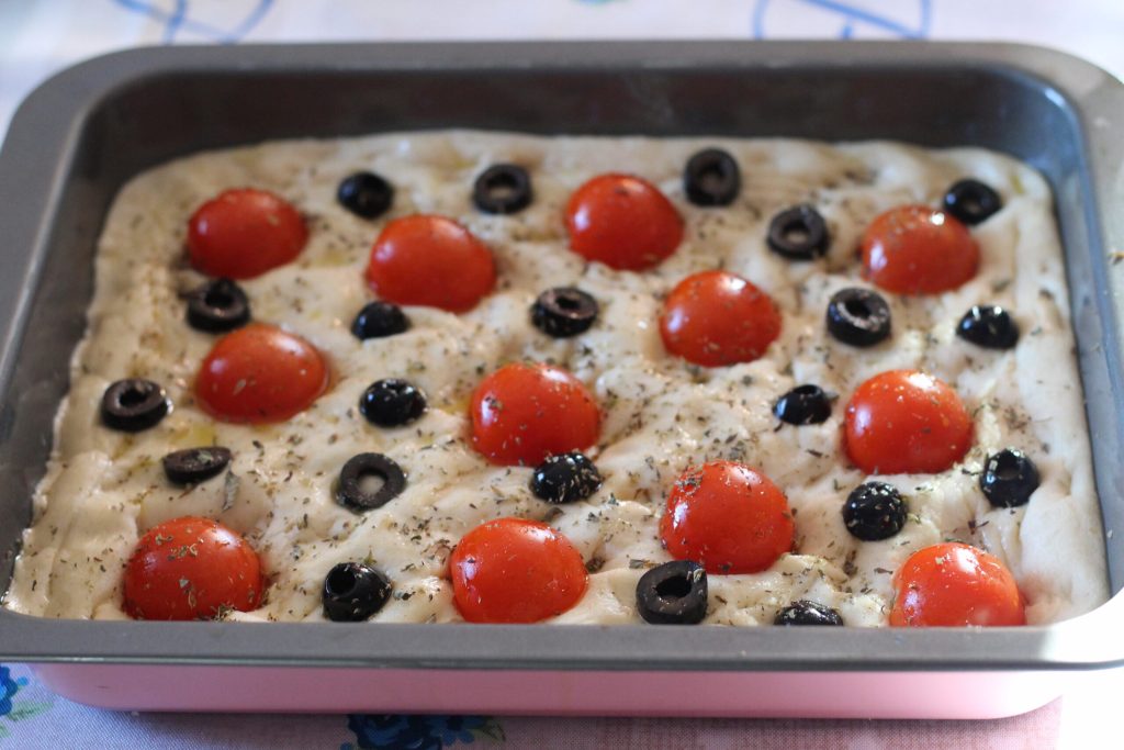 Na de rijstijd, neem het deeg weer. Vet een bakvorm goed in met extra vergine olijfolie (je kunt een ronde of rechthoekige bakvorm gebruiken zoals ik deed. Mijn bakvorm met iets verhoogde randen is 22 x 28). Neem het deeg met met olie ingevette handen en spreid het uit in de bakvorm door met je vingertoppen te drukken zodat er kuiltjes ontstaan.