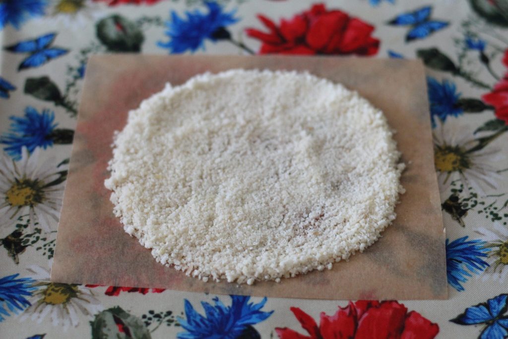 Om de parmezaanmandjes uit de magnetron te maken, begin je met het klaarmaken van vierkanten van bakpapier van ongeveer 20 cm. Voor een mooie grote wafel heb ik ongeveer 20 gram parmezaan gebruikt (3 eetlepels parmezaan). Gebruik een lepel om de kaas goed uit te smeren. Let op dat je niet te weinig kaas in het midden laat, anders loop je het risico dat ze breken.