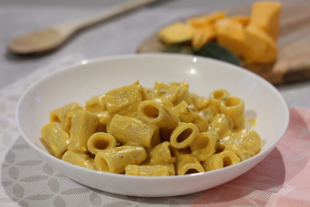 Voeg vervolgens een half glas water toe en kook nog eens 10 minuten met deksel totdat de pompoen zacht is. Giet in een pan water en grof zout en zet op het vuur. Wanneer het kookt, voeg de pasta toe en kook het volgens de instructies op de verpakking. Je kunt het type pasta kiezen dat je het liefst hebt, ik heb in dit geval gekozen voor mezze maniche rigate. Giet de pasta af en bewaar eventueel een scheutje kookwater om de crème te verzachten. In mijn geval was er geen kookwater nodig, de crème was erg zacht, maar het hangt af van persoonlijke voorkeur.