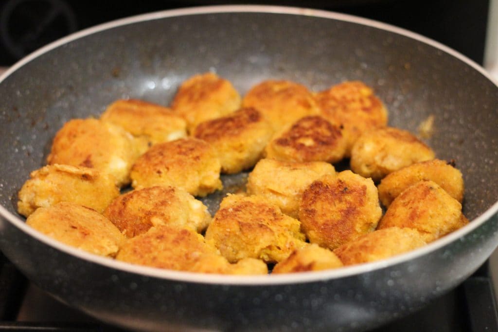 • Bereid alle balletjes door een deel van het mengsel te nemen en leg ze allemaal op een bord. Haal de balletjes door het paneermeel en verwarm intussen wat extra vierge olijfolie in een pan en bak de balletjes nu tot ze goudbruin zijn. Draai ze af en toe om. Dit duurt ongeveer 6-7 minuten. Laat ze uitlekken op keukenpapier om de overtollige olie te verwijderen.