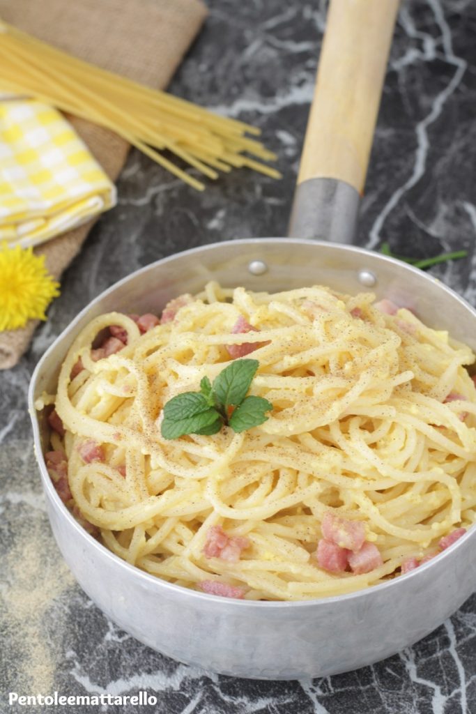 De Carbonara is het gerecht dat Rome, de Romeinse cultuur en Italië over de hele wereld kenmerkt. Een eenvoudig hoofdgerecht gemaakt met zeer weinig ingrediënten die ieder van ons zeker minstens één keer heeft bereid of geproefd. Er moet gezegd worden dat er verschillende meningen zijn over de te gebruiken ingrediënten, zo is er iemand die spek verkiest boven wangspek, iemand die penne boven spaghetti en iemand die Parmezaanse kaas boven Pecorino Romano verkiest. De traditionele recept vereist echter zonder twijfel spaghetti, wangspek, eieren, peper en Pecorino Romano en ik heb ze gebruikt om u dit heerlijke gerecht aan te bieden proberen elke smaak goed te mengen en ze in de mond voelbaar te maken.