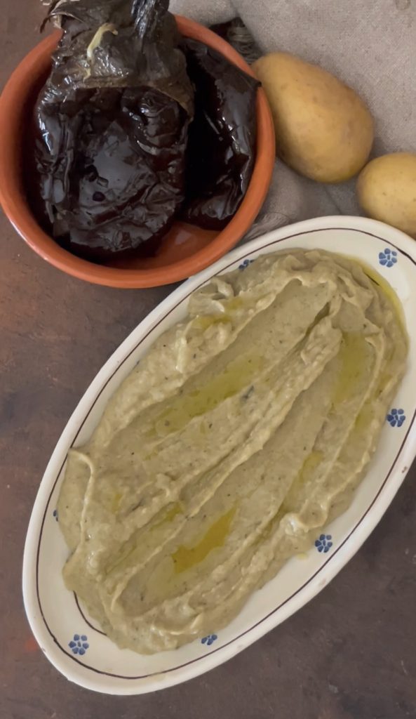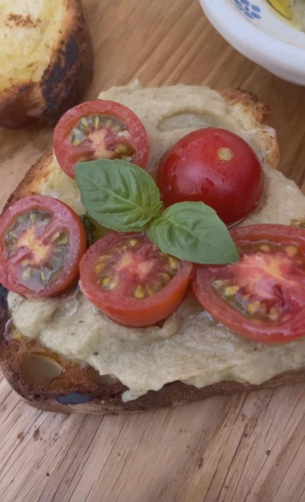 Een recept dat geschikt is voor deze hete periode om ruim van tevoren te maken? Probeer deze AUBERGINE- EN AARDAPPELCRÈME VOOR BRUSCHETTA. Ik begrijp dat de oven aanzetten met deze hitte een beetje eng is, maar ik verzeker je dat het echt de moeite waard is. Uiteindelijk denk ik dat het nog erger is om in de buurt van het fornuis te zijn. Maar 35 minuten in de oven is niet zo erg, geloof me. Meestal maak ik deze crème de dag ervoor, zodat alles klaar is wanneer je de volgende avond gasten hebt. Met deze auberginecrème maakte ik 8 bruschetta’s, eerst besmeerd met olie op de grillplaat en belegd met deze geweldige crème en cherrytomaatjes, alles met de intense geur van verse basilicum.