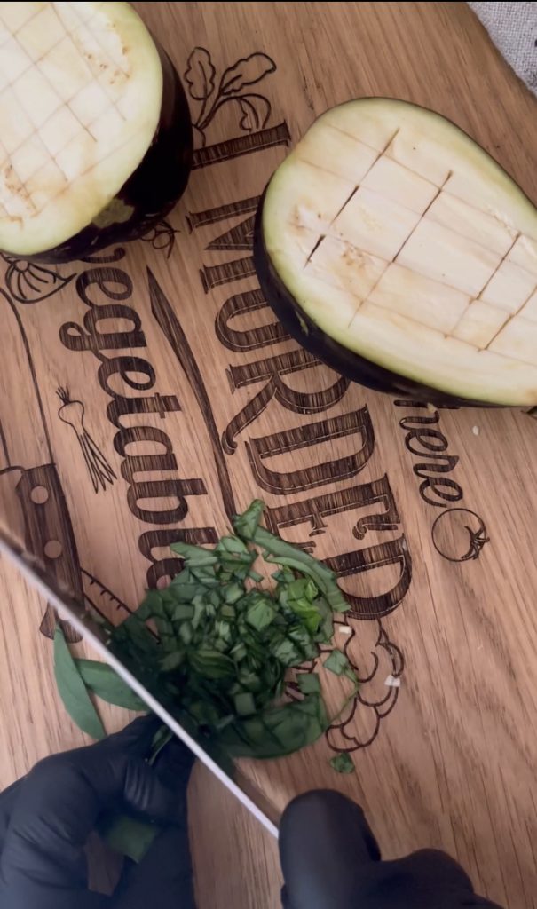 Plaats de aubergines met de gesneden kant omhoog en besprenkel met de gearomatiseerde olie. Bak in een voorverwarmde oven op 180°C gedurende 35 minuten