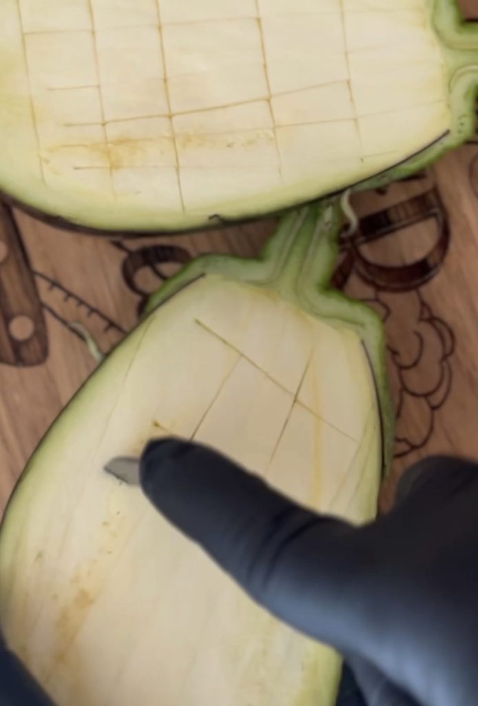 Was de aubergines, droog ze af, halveer ze en snijd ze in met een puntig mes.
