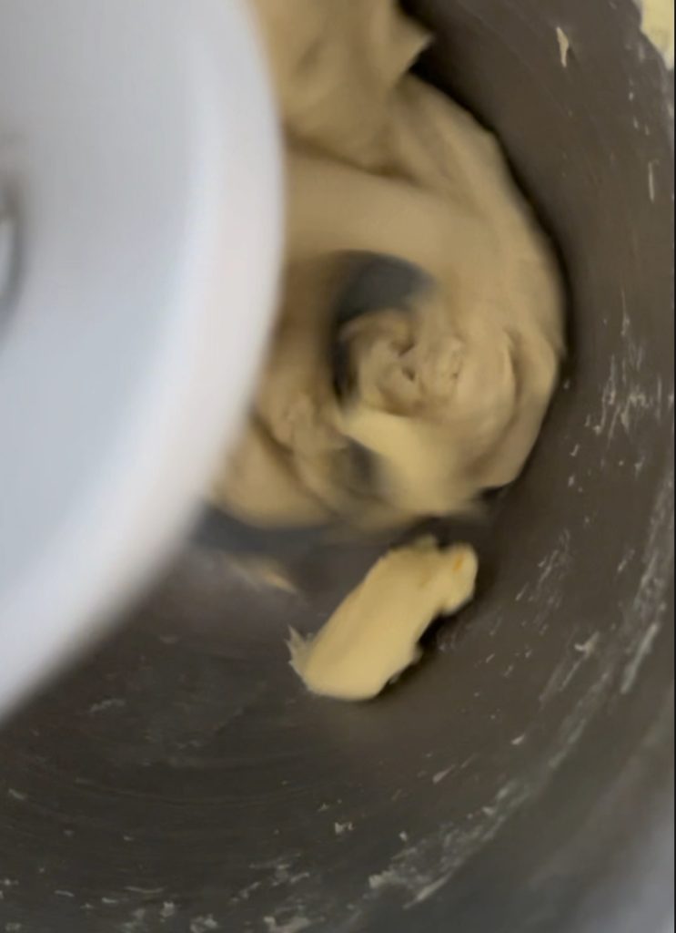 Voeg op dit punt het zout toe en beetje bij beetje de zachte boter, voeg het tweede stuk toe nadat het eerste goed is opgenomen door het deeg.