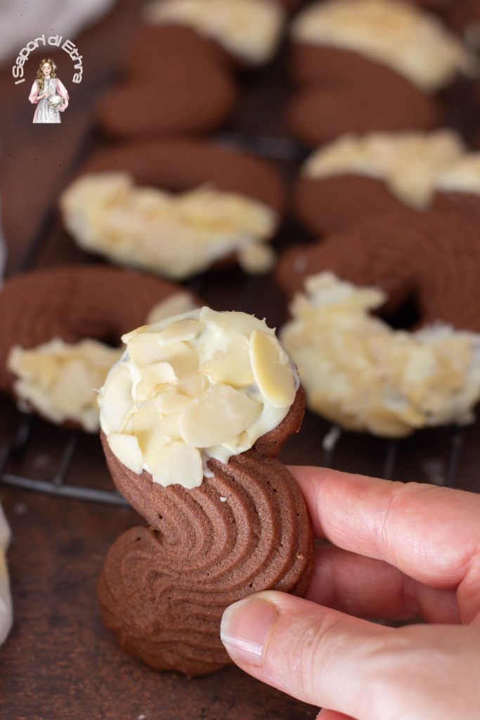 Vandaag wil ik dit recept met jullie delen dat me zoveel voldoening heeft gegeven, zowel door de snelheid van bereiding als door zijn oneindige smaak, de Cacao spritskoekjes geglazuurd met witte chocolade en bestrooid met geroosterde amandelschilfers. Wie van chocolade houdt, kan deze heerlijke cacao spritskoekjes niet weerstaan! Ze zijn zacht van binnen en krokant van buiten, en smelten in je mond met een intense cacaogeur. Ook zonder glazuur zijn ze heerlijk. Perfect voor een smakelijke snack of bij de koffie. Het maken van deze koekjes is makkelijker dan je denkt! Met weinig ingrediënten en stappen krijg je zachte en smakelijke koekjes, ideaal voor beginners in de keuken. Op de blog vind je veel verschillende soorten frolla, zoals de Milano frolla. Probeer deze ook, want hij is echt eenvoudig en smakelijk.