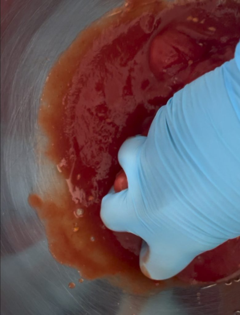 In een kom de gepelde tomaten gieten en met de handen platdrukken.