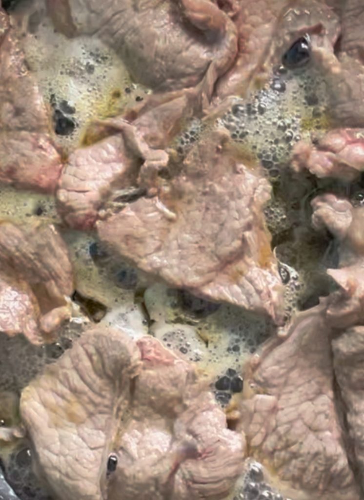 Blijf de bereiding op het fornuis voortzetten gedurende ongeveer 60 minuten. De duur hangt sterk af van de vleessoort die je slager je geeft. Het mijne was niet al te dun. Dus als het vlees heel dun is kun je het ongeveer 20 minuten koken, maar als het vlees dik is, zoals het mijne, dan een uur.
